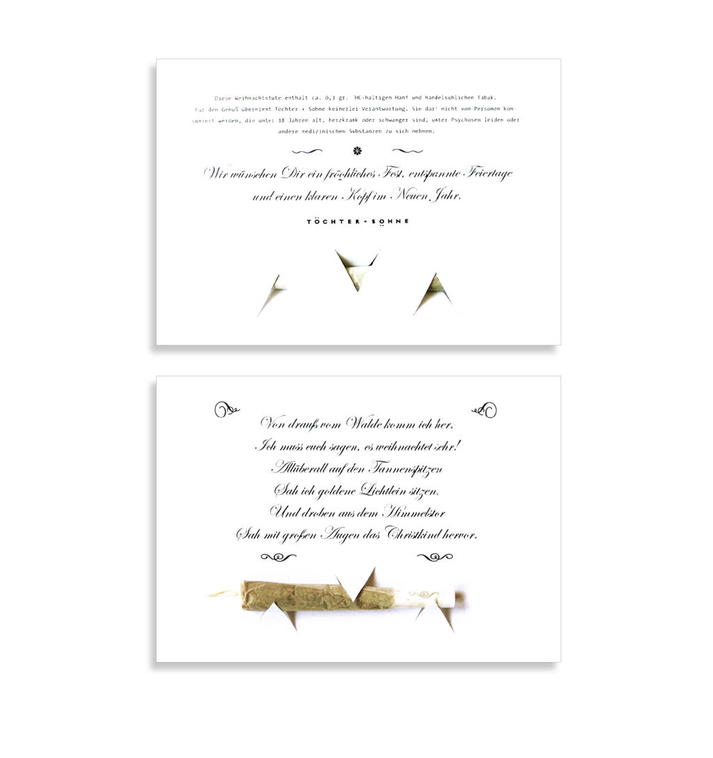 Pour remercier les clients, les soutiens et les anciens employés qui étaient fidèles à ›Töchter + Söhne‹, un joint de Noël leur a été envoyé. C’est la manière typique un peu effrontée de ce bureau. La publicité a reçu beaucoup de réponses positives et a été remerciée par plusieurs nouvelles commandes. Toutes les personnes étaient défoncées par cette idée.