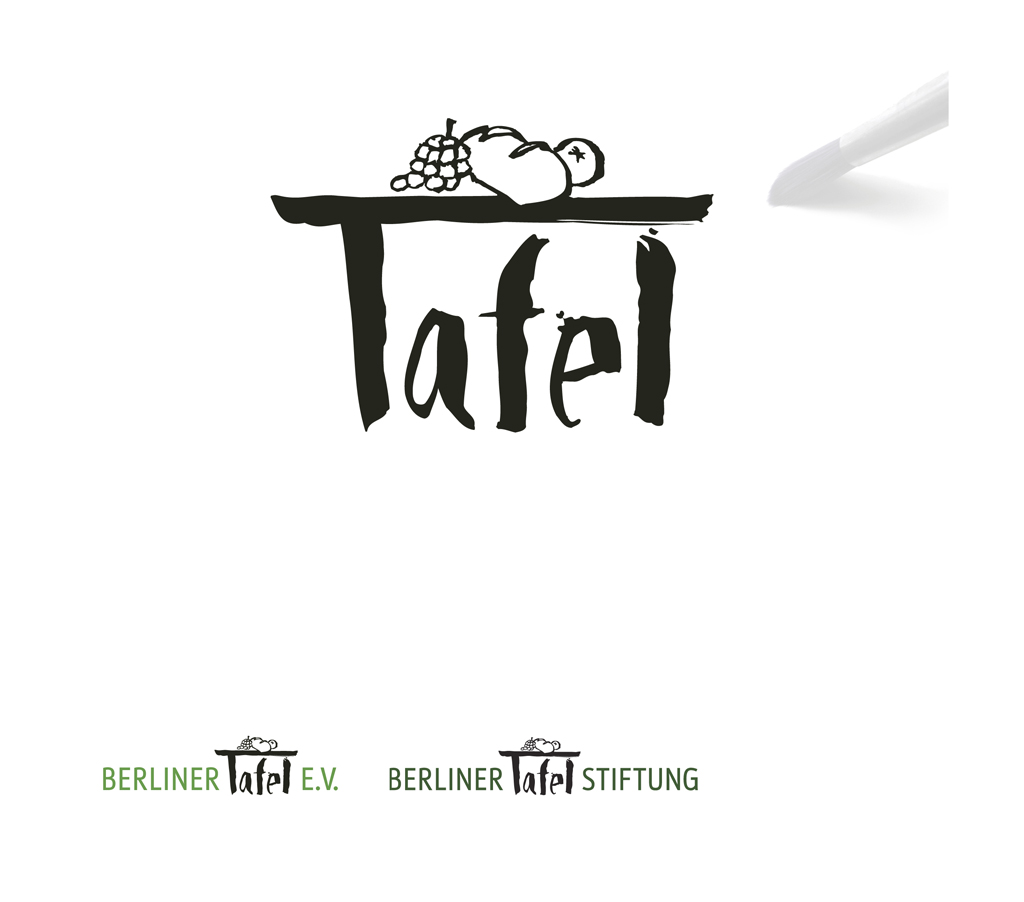Um die menschliche Wärme hinter diesem Anliegen zu vermitteln, ist das zum Bild ausgearbeitete Wort ›Tafel‹ mit einem Pinsel geschrieben. Je größer die Darstellung wird, desto stärker tritt die handwerkliche Qualität, die menschliche Handschrift hervor. Die Ernsthaftigkeit des Unterfangens wird durch den umgebenden typografischen Rahmen betont.