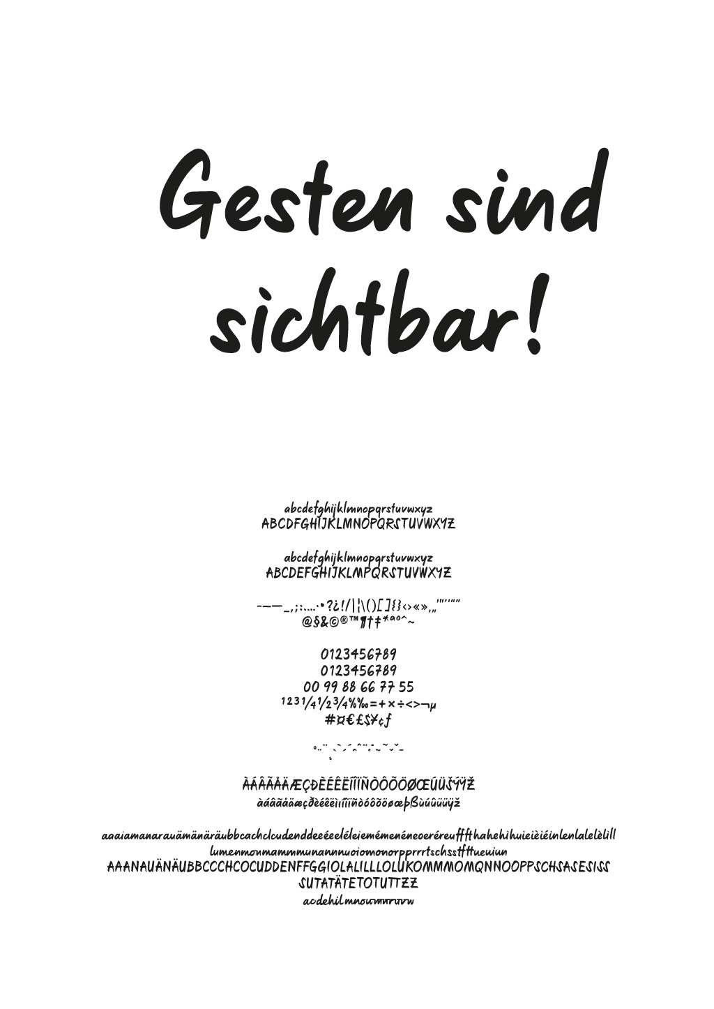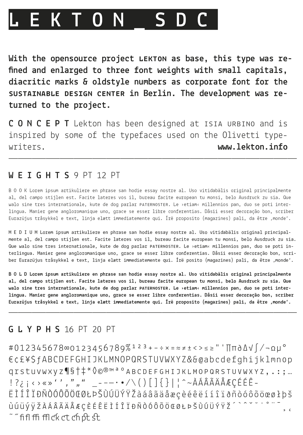 Le dessin de cette famille de caractères est engagé dans un projet de l’école supérieure de Potsdam avec le Prof Lu(as) de Groot. La famille s’est nourrie peu a peu des possibilités typographiques et des langues internationales.