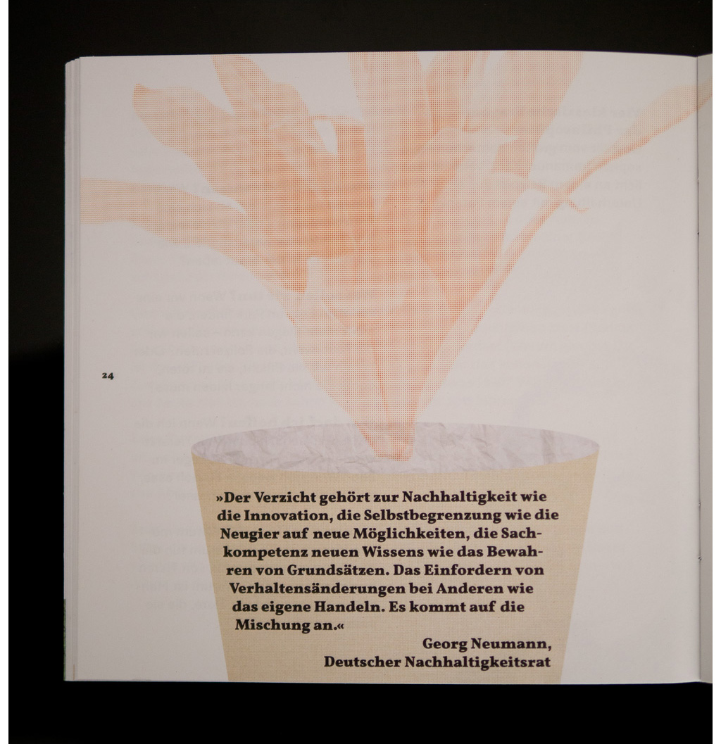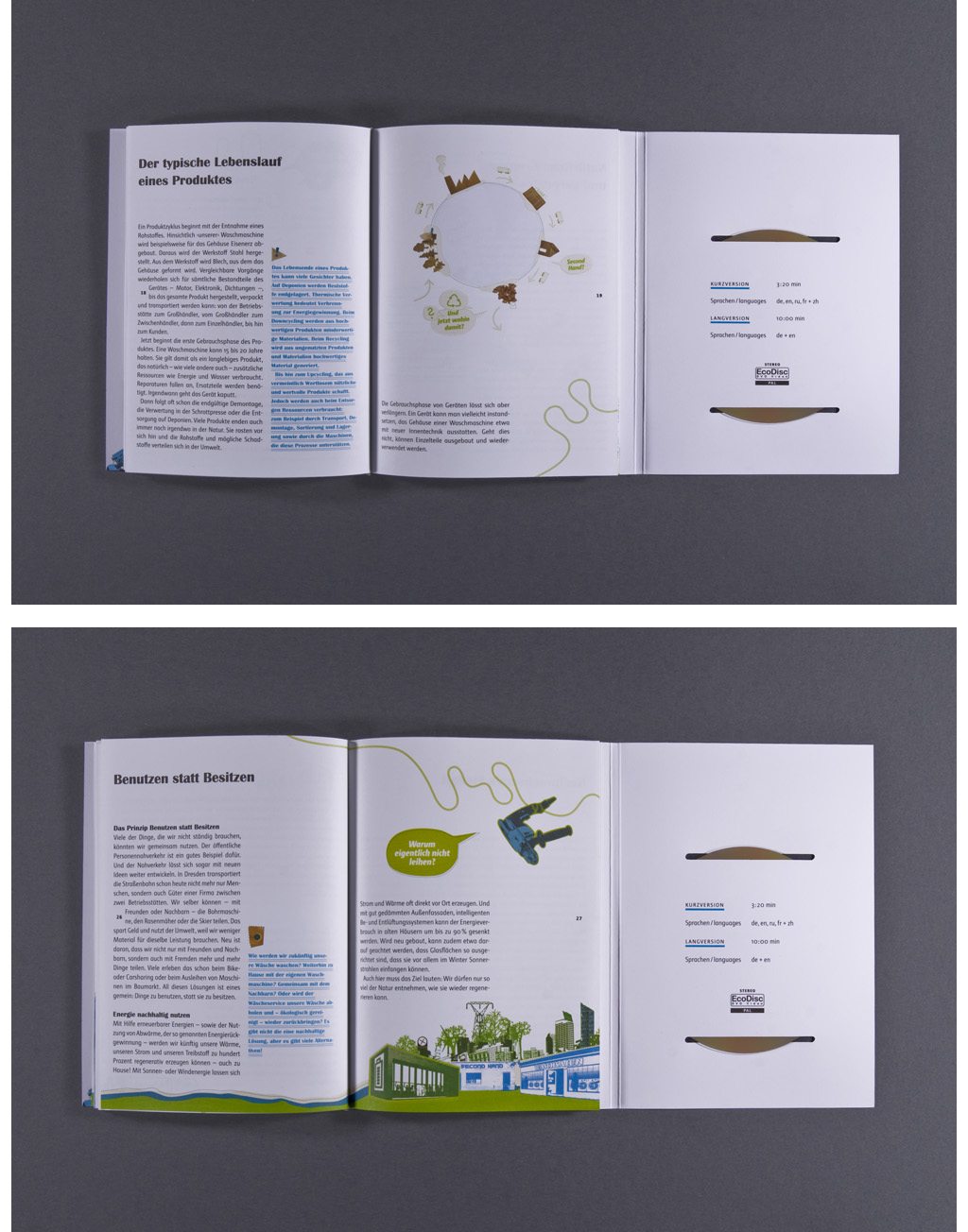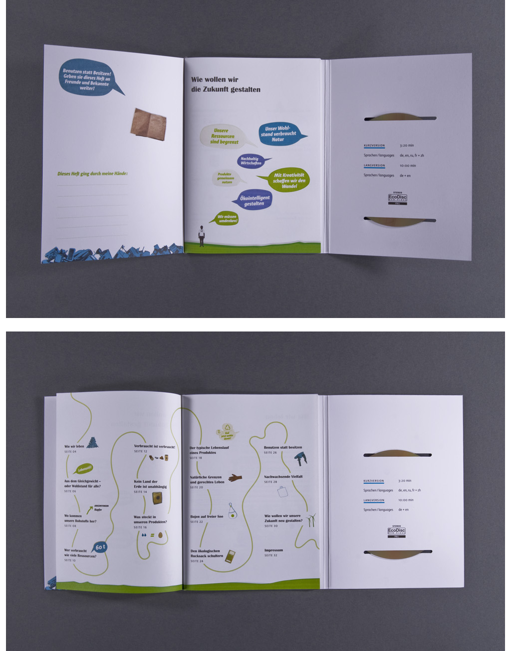 Zusammen mit Lea Brumsack wurde diese Broschüre im Auftrag des SDC für das Umweltbundesamt gestaltet und produziert. Neben dem typografischen Konzept lag der Fokus auf einer umweltfreundlichen Gestaltung und Produktion. So wurden bei der Broschüre keine Klebstoffe oder Metallklammern verwendet, allein der geschickte Einsatz eines wiederverwendbares Gummibandes und Stanzungen halten Broschüre und mitgelieferte DVD. Papier, DVD und Druckfarbe wurden nach umwelttechnischen Kriterien ausgesucht und verwendet.