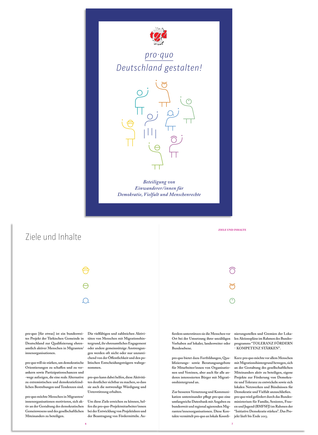 Die Türkische Gemeinde Deutschland initiierte das Projekt pro.quo. Dieses Projekt unterstützt Migranteninitiativen, die eigene Projekte um das Thema Demokratie beginnen wollen. Das 32-seitige Layout zeigt Einblicke in den Projektverlauf und illustriert, wie einfach es ist selbst ein Projekt zu starten.