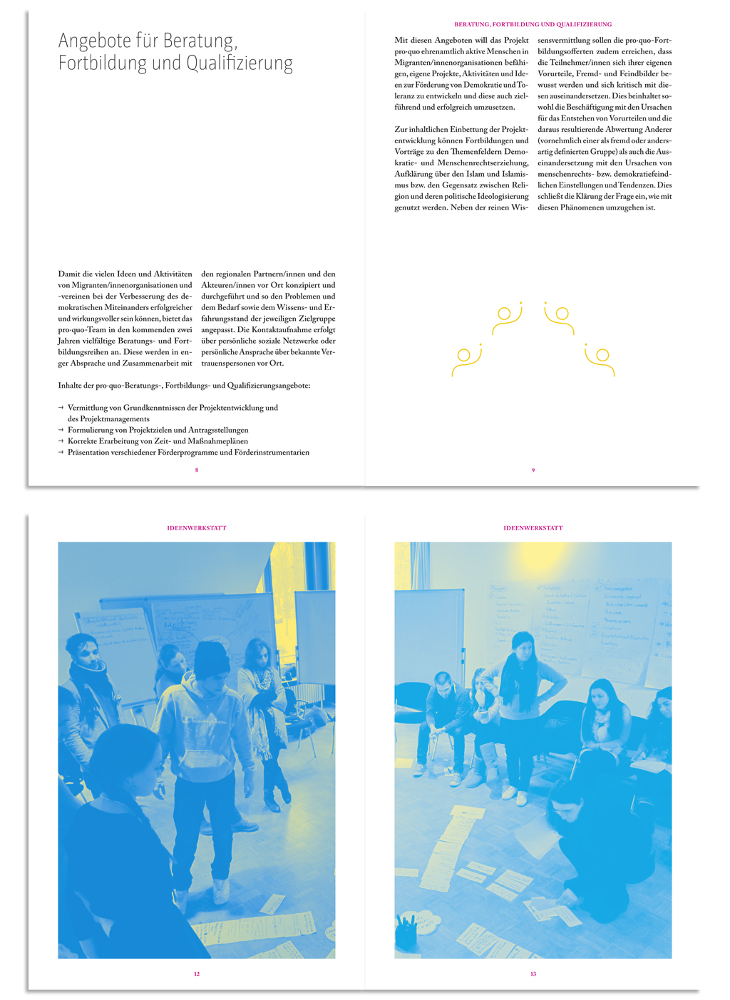 The title shows different humans as icons, referring to the personal action needed in a cultural, ethical and religious divers society longing for democracy. The content (mainly text), playfully changing between one or two columns. This mediates a feeling of conversation and is flavoured with colourful images of meetings and working situations. The images are duplexes of process colours.