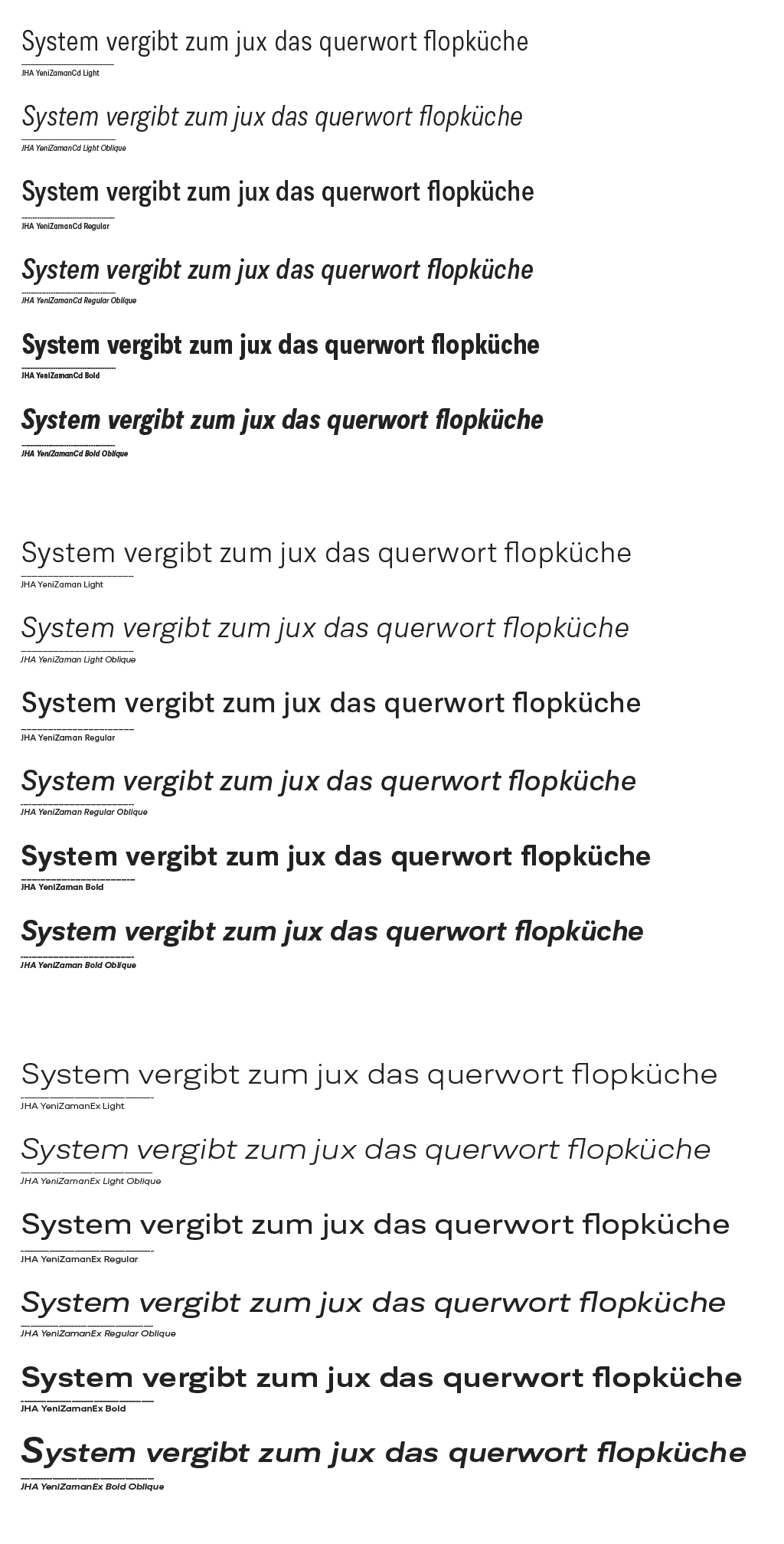 Die Schrift war ausschließlich für ein Projekt gedacht. Wie so oft, wurde Schrift zu einer Schriftfamilie vergrößert, um größeren typografischen Aufgaben gewachsen zu sein. Die Formensprache hat ihre Wurzeln in den 30igern, dem Höhepunkt de ›Moderne‹. YeniZamans formale Ausgestaltung ist noch strikter ausgeführt und ihr Rhythmus in das Jetzt geführt.