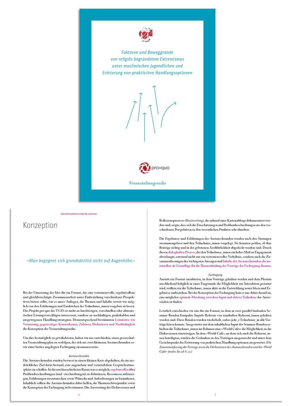 Die zweite Broschüre des Projektes pro.quo der Türkischen Gemeinde Deutschlands, behandelt eine Veranstaltungsreihe zum Thema des religiös begründeten Extremismus unter muslimischen Jugendlichen. Die Broschüre ist der Abschluss der partizipativen Veranstaltungen, die die vielfältigen Ursachen dieses Phänomens beleuchten, nicht ohne auf die Verantwortung der deutschen Mehrheitsgesellschaft zu verweisen. Gestalterisch schließt sich dieses Heft an das erste Layout an. Die Gestaltung ist darauf bedacht den Inhalt ernsthaft und gut aufbereitet weiterzugeben.