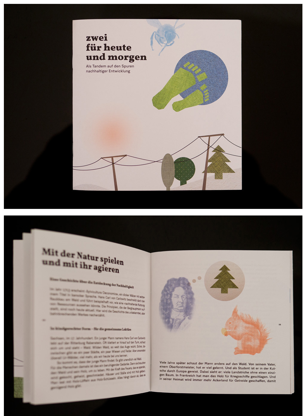 ›zwei für heute und morgen‹ spannt dabei die Brücke zwischen den Generationen und illustriert die komplexen Zusammenhänge, die sich hinter dem abstrakten Begriff verbergen. Die Gestaltung von Illustration und typografischem System ist in enger Zusammenarbeit mit den Projektleitenden entstanden.