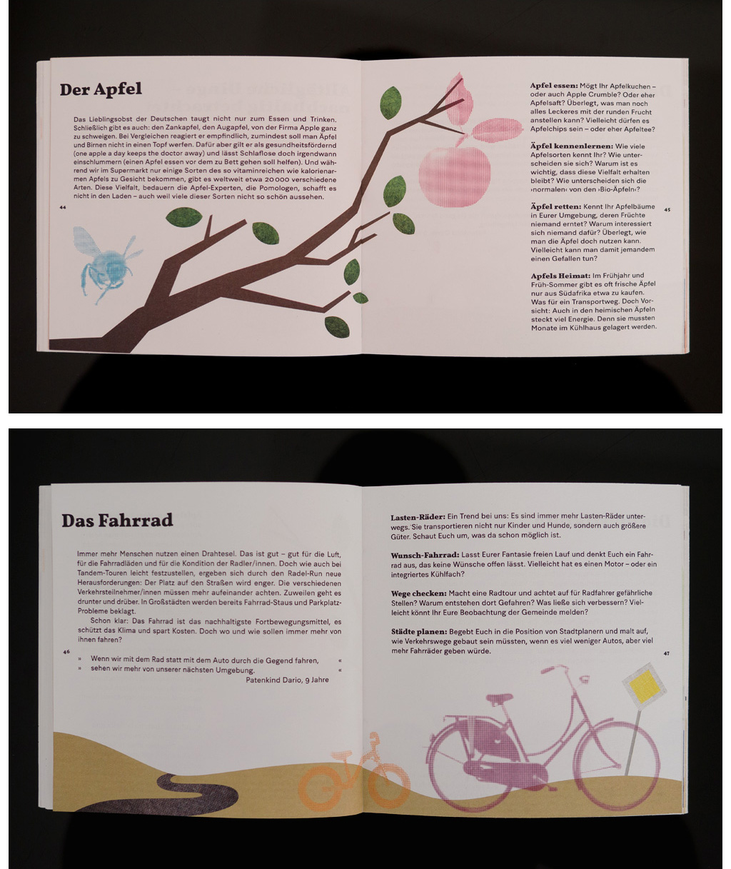 The leaflet is bridging both generations and is illustrating the complex connections hiding in the abstract term ›sustainability‹. The design of illustration and typographical system is developed in cooperation with the project managers.