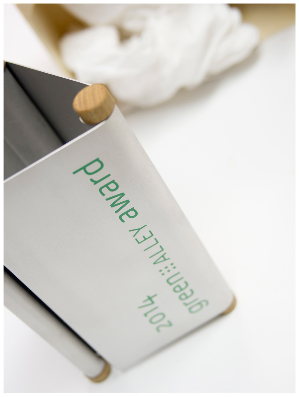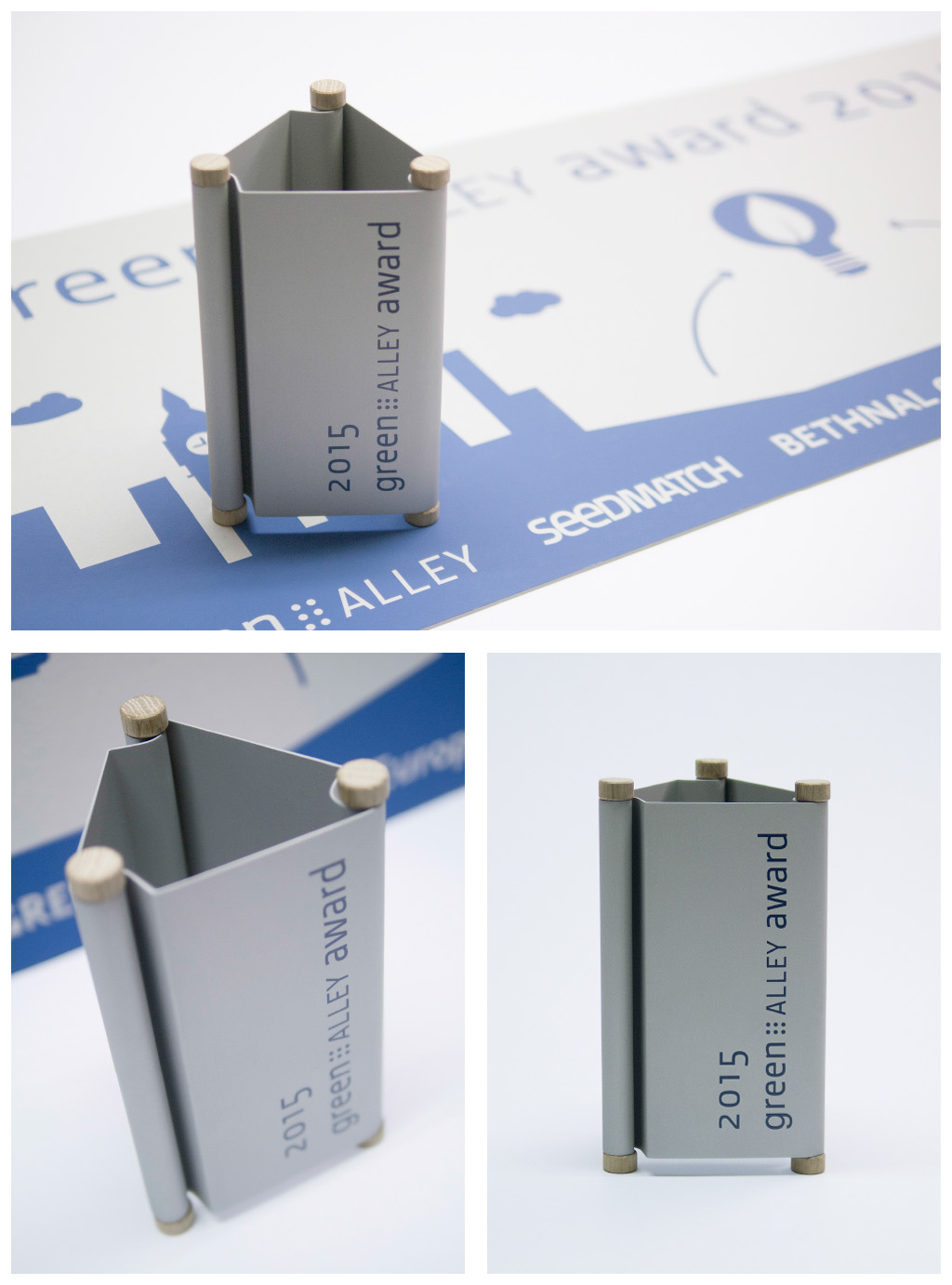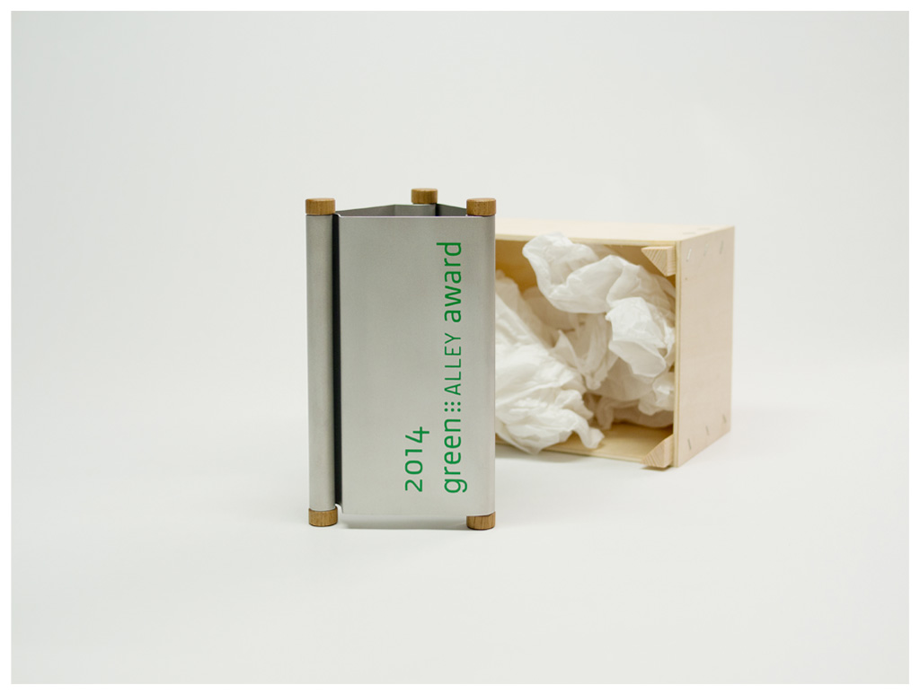 Der ›Green Alley Award‹ wird für neu gegründete Unternehmen ausgelobt, die mit innovativen Produkten im Bereich der Wiederverwertung und der Abfallwirtschaft an den Markt gehen. Der gestaltete Preis steht für die Ideen der Ausgezeichneten. Er ist aus ausgemusterten Industrierolltorpaneelen aus Aluminium gefertigt. Die Paneele sind lösbar mit Holzstäben zu einem dreieckigen Körper verschränkt. Der Körper ist somit später auseinandernehmbar und kann in den verschiedenen Stoffgruppen dem Recycling zugeführt werden.