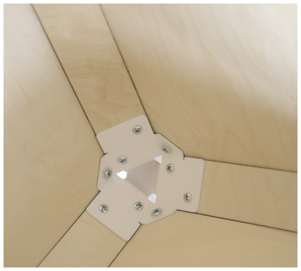 The ›Green Alley Award‹ is awarded to newly formed start-ups entering the market of waste management and recycling with innovative new products. The newly created prize is given for the ideas of those honored. It is constructed out of rejected aluminium panels from the manufacturing of industrial overhead doors. The panels are attached with removable wooden rods to form a triangular body. The whole construction can be taken to pieces for recycling.