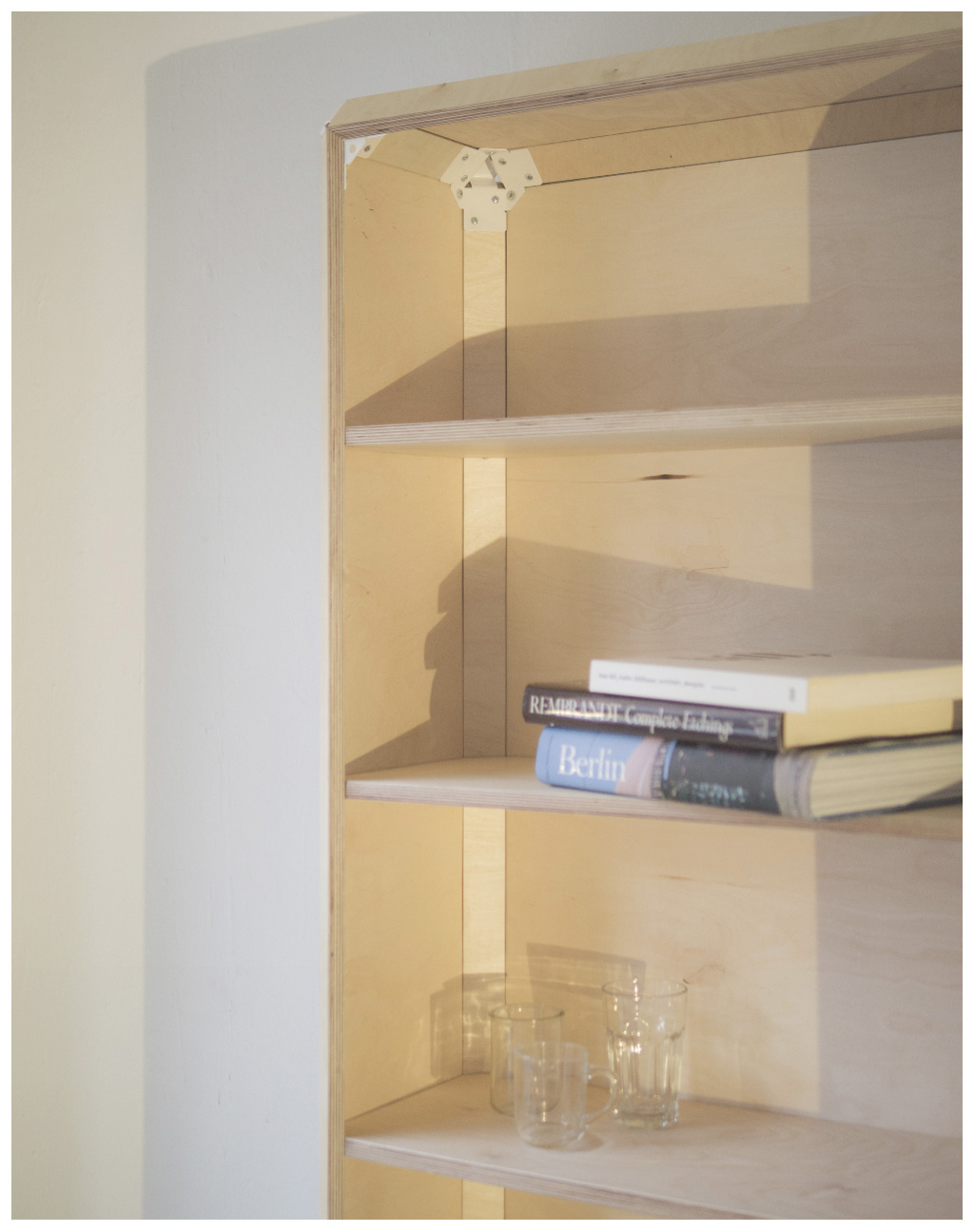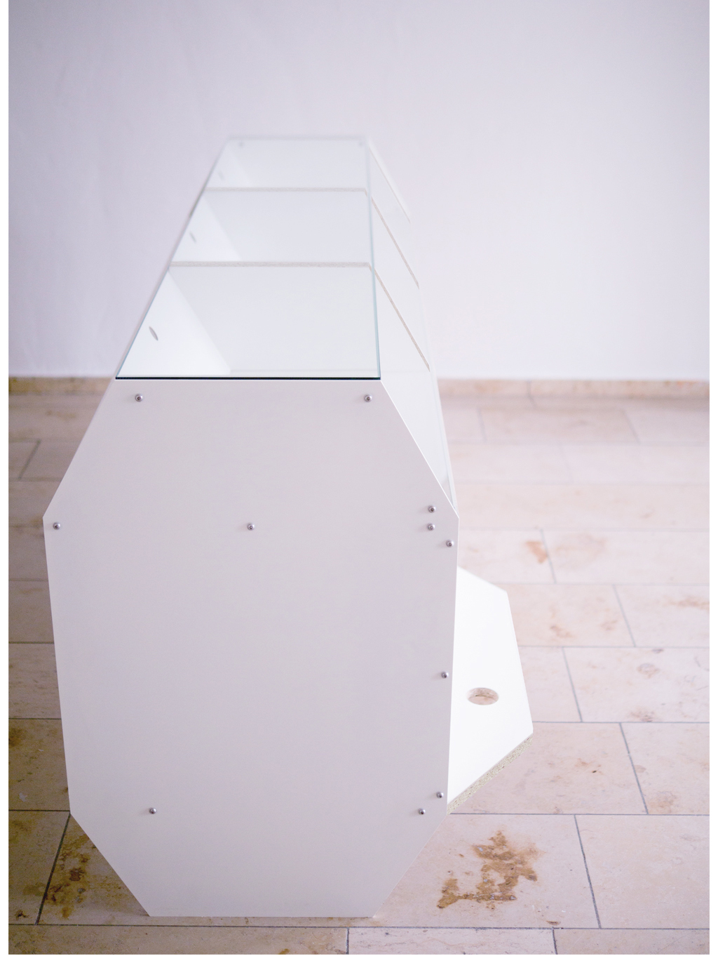 The Display Case was designed and produced for the medical supply shop OTH in Berlin. The shop’s owners wanted to transfer the clean and white aesthetic of the existing interior to its sales area. The formal appearance follows the function of the fitment which are representation, structure of space and organization of storage space for clients and employees. These aspects coupled with the requirement of a simple production and installation demanded the use of powder-coated steel, melamine resin coated plywood and glass.