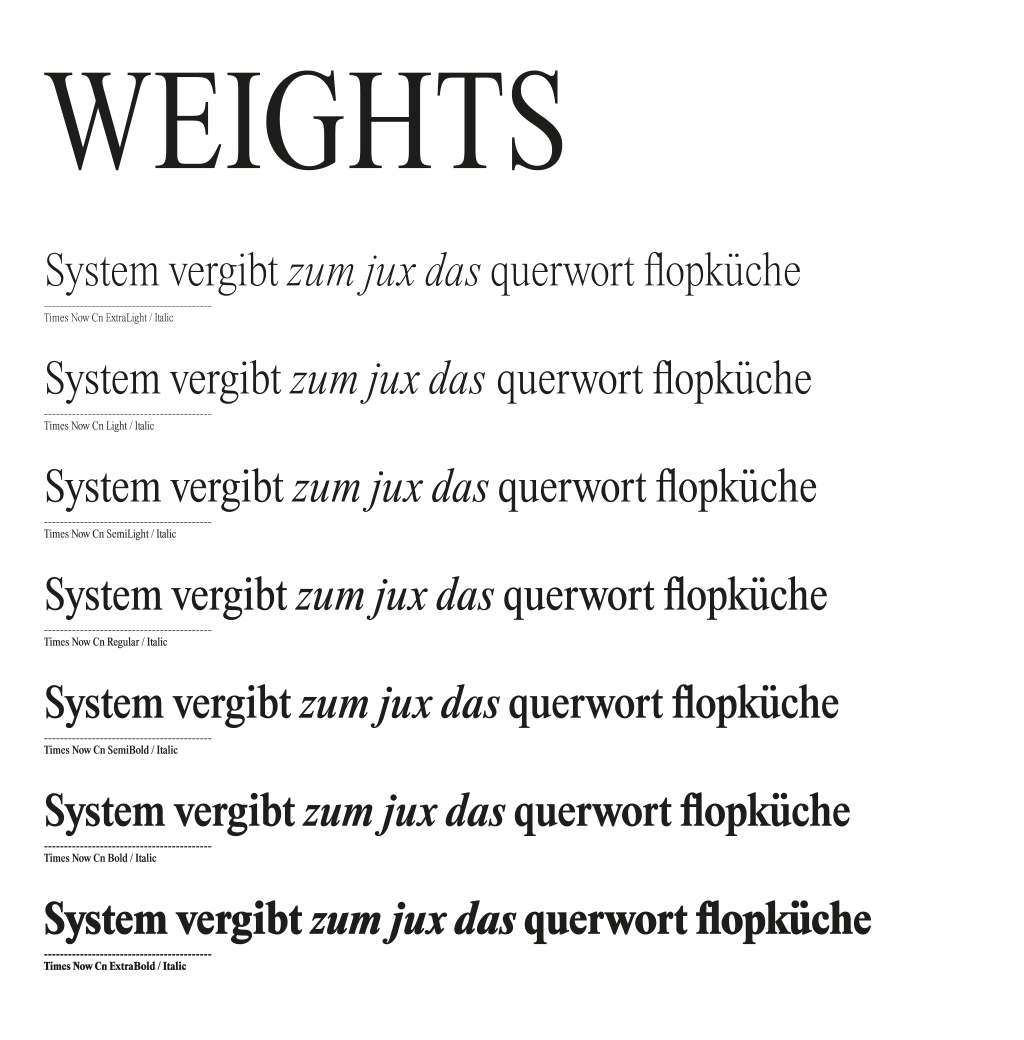 One of the most ubiquitous typeface nowadays receives a suiting companion. Sumptuously cut ›Times Now‹ brings a rainbow of greyscale to the monitor and paper. You don’t like the Times New Roman®? It’s not her fault. Now you can let your text play its melody on a neobaroque organ in all ranges fine tuning from silent to loud and all nuances in between to complete your harmony. Now not only in different weights, but with a condensed variation.