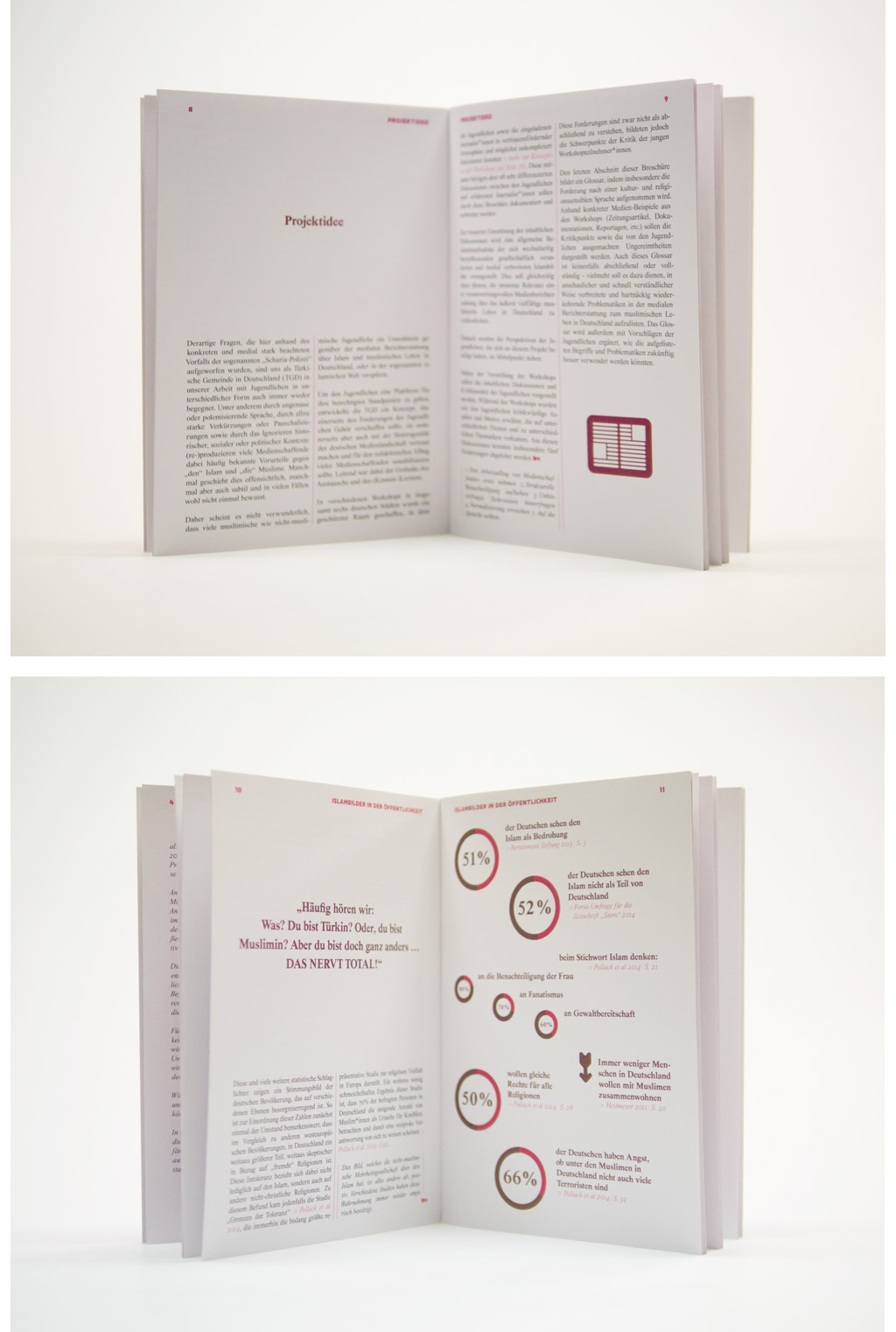 This second booklet for the project pro.quo of the Turkish Community in Germany contents a lectures about religious extremism of muslim youths. It concludes these participatory lectures, which depicts the phenomenon of extremism even by accentuating the responsibility of the German civile society. It design principles follows the layout of the first booklet. The layout presents the content in a serious and informative manner.