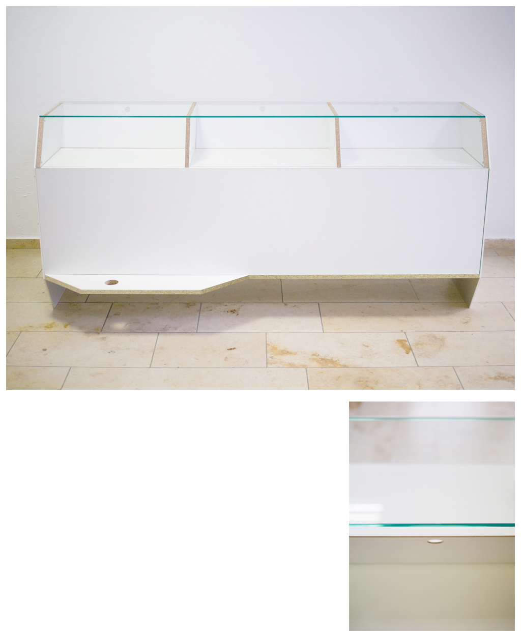 Der Tresen wurde für ein neues Ladengeschäft des Sanitätshauses OTH in Berlin gestaltet und gefertigt. Die Besitzer wollten die klare, weiße Ästhetik der Einrichtung auf den Verkaufsbereich übertragen wissen. Die Formsprache und der Aufbau folgen der Aufgabe des Möbelstückes. Repräsentation, Raumgliederung und Ordnung der Abstellflächen für Kunden und Mitarbeiter. Die einzelnen Funktionen des Möbelstückes und einfache Verarbeitungstechniken gaben den Materialeinsatz von pulverbeschichtetem Stahl, Melaminharz beschichtetem Sperrholz und Glas vor.