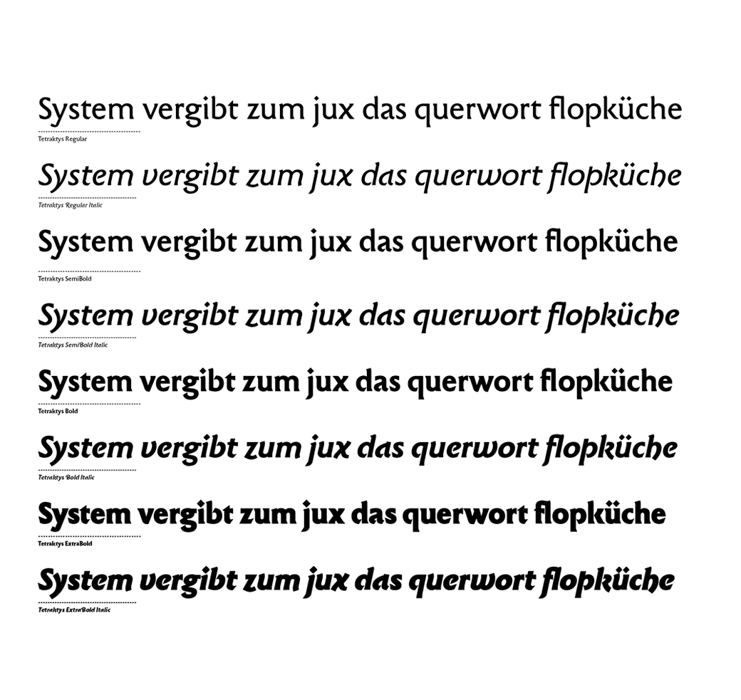 Chiseld in binary code. Tetraktys traces the aesthetic of wedge and curve in Latin inscriptions over the sixties and brings it to the digital present-day. The Swiss Designer Ernst Friz created the type ›Friz Quadrata‹, which is the inspiration for Tetraktys. Tetraktys adopts the structure of circle, triangle & square as well as their internal forms. Even in its richness of detail Tetraktys strives for formal reduction. This is remarkable in bigger font sizes and calms the rhythm in reading sizes. Many of the letters of the italic counterpart possess a particular structure without losing its formal link.