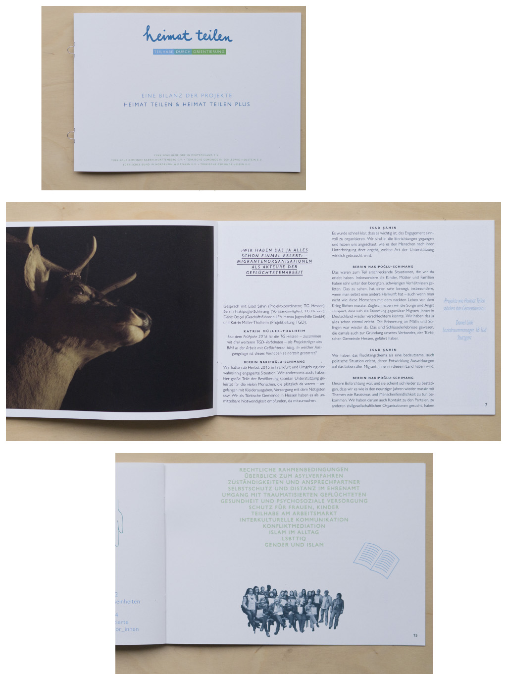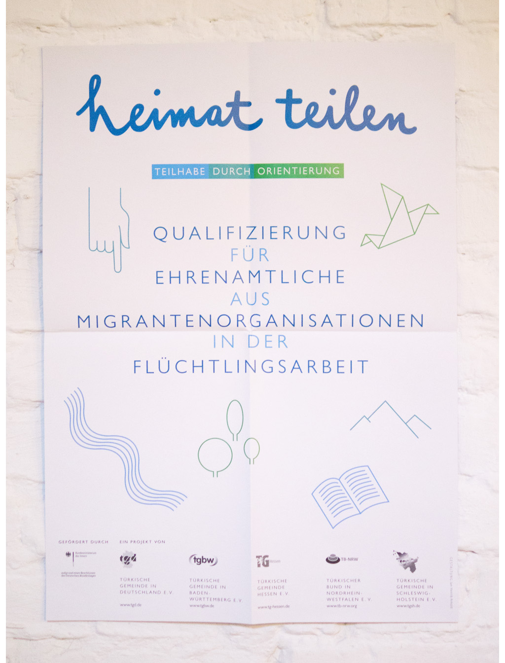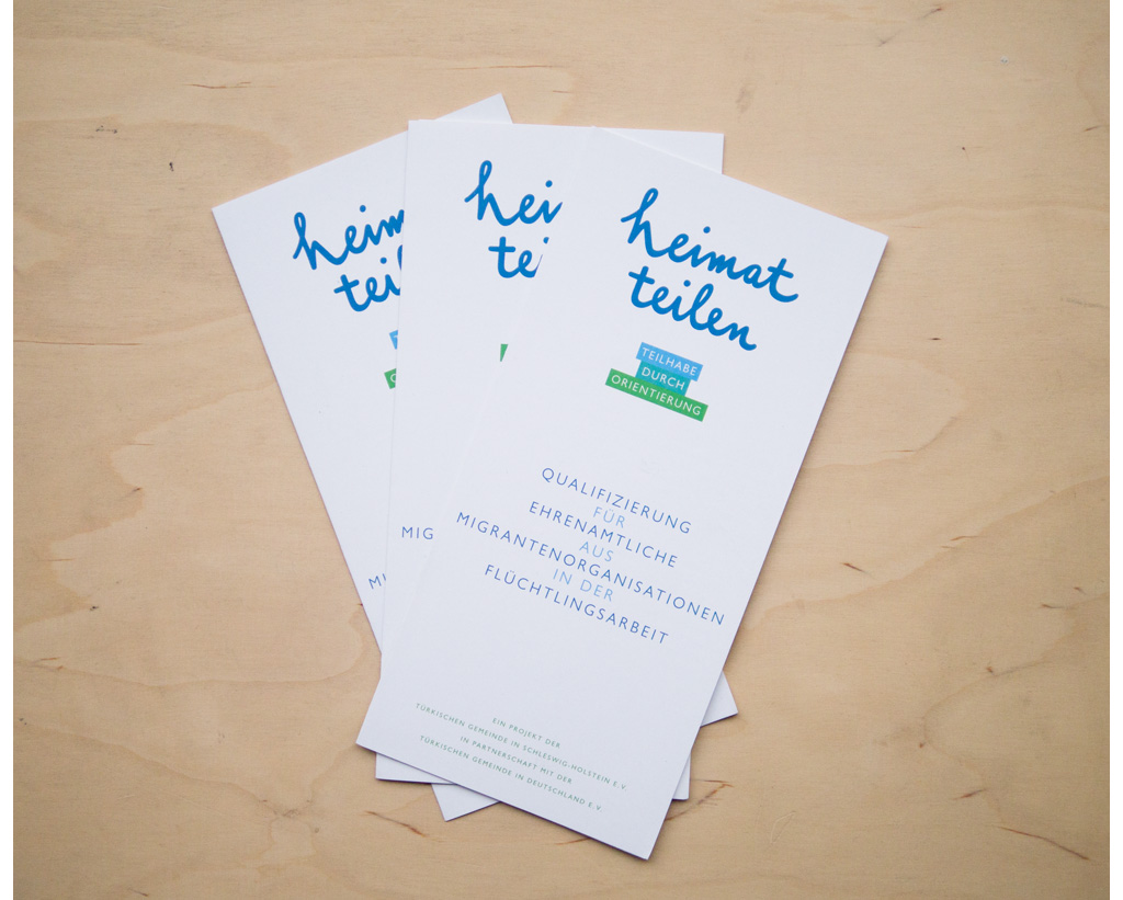 ›Heimat teilen, Teilhabe durch Orientierung‹ (Partager la patrie, participation par des conseils) est un projet organisé par la communauté Turque d’Allemagne et soutenu par le gouvernement fédéral Allemand. Ce projet renforce et soutient les partenaires et les initiatives dans leurs travaux avec les réfugiés. Les parties impliquées sont assistées dans la structure professionnelle, la qualification et le soutien pratique. L’aspect visuel choisi est un accueil visuel agréable sans toutefois dénaturer son intégrité et son professionnalisme. L’écriture manuscrite ›Heimat teilen‹ est l’élément clé, bien souligné en plus par le slogan coloré. L’affiche et les brochures sont illustrées seulement par des lignes. Tous les éléments, y compris la police de caractères choisie, conviennent à toutes sortes d’applications.