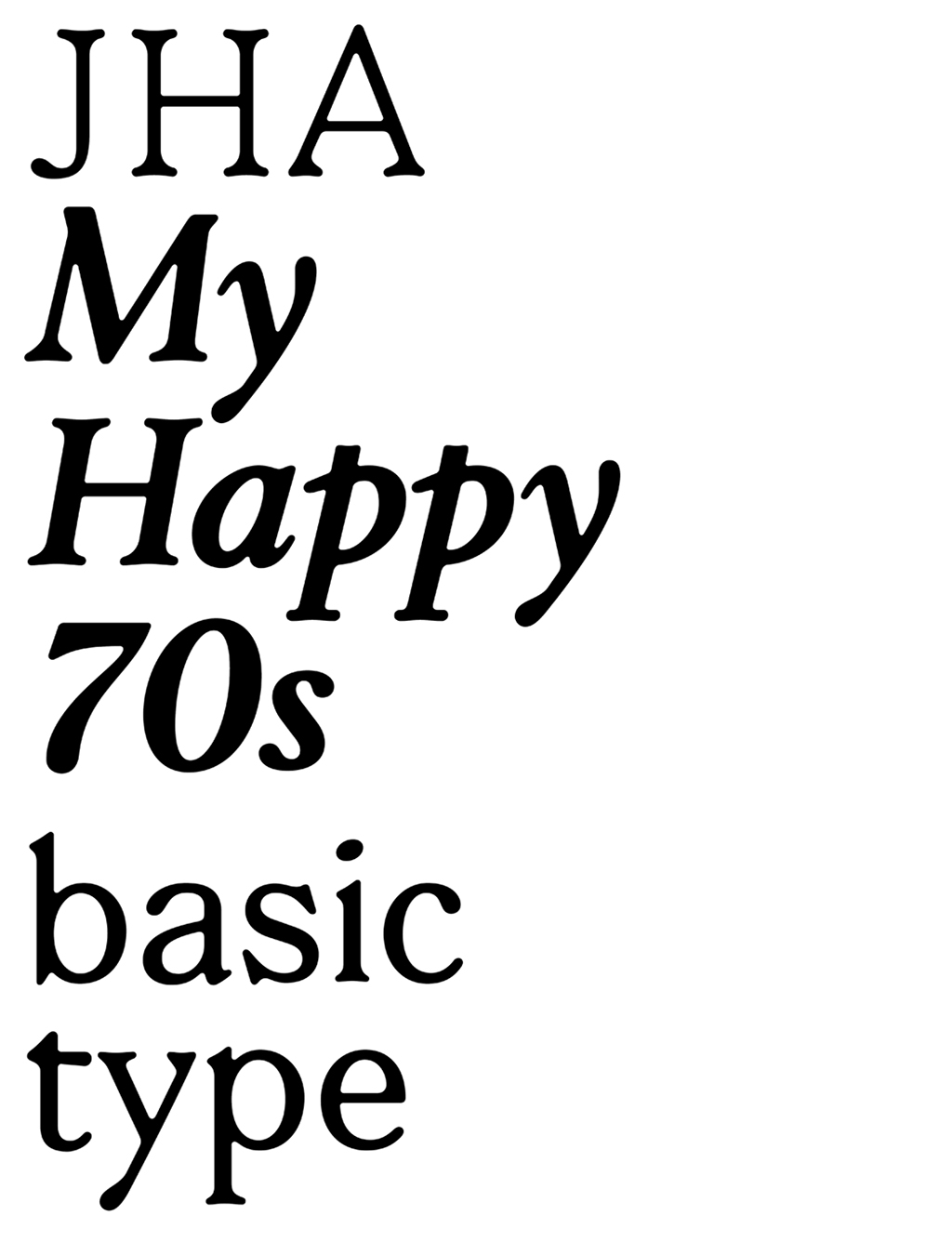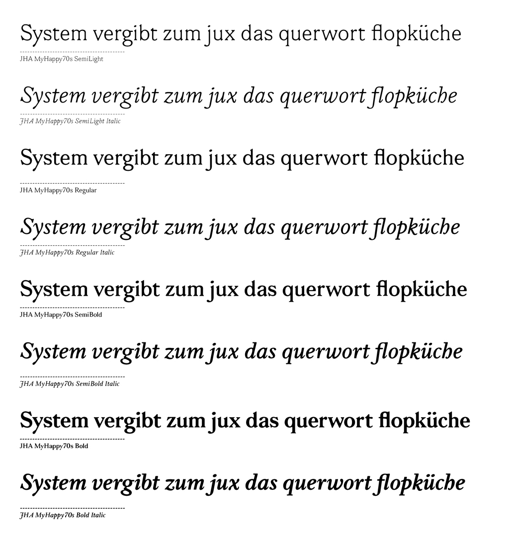 ›My Happy 70s‹ has its roots in the baroque, yet is influenced by the type design of the following centuries. The type took formal elements and subtle spatial references from this time span but the main character remains true to its origin. Examples printed from metal type in this era reveal an enlargement of the curvature of the font which back then was caused by the flow of ink and the process of stamping. The resultant friendly look-and-feel of ›My Happy 70s‹ is transferred and reinforced in the italic lending a spy affirmation to the here and now.
