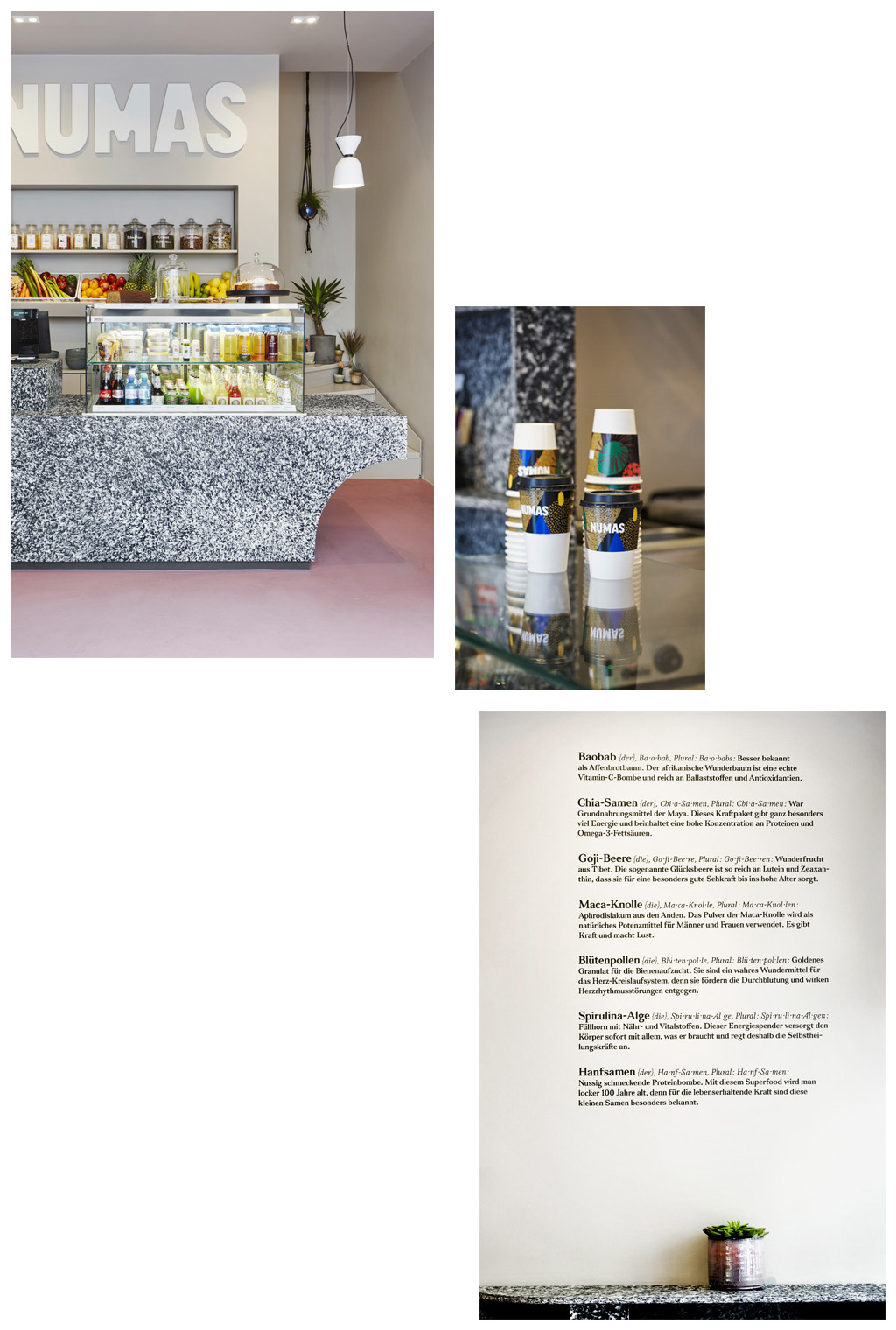 Le nom de la marque du restaurant ›Numas‹ dans le centre ville de Berlin a été façonné par Marek Polewski, qui sur l’ensemble de la surface de ce concept y a inclus la police de caractères ›My Happy 70s‹ pour marquer et définir son identité visuelle. Le jeu entre la texture et la couleur s’oppose par une forme de lettrage plus étendue.