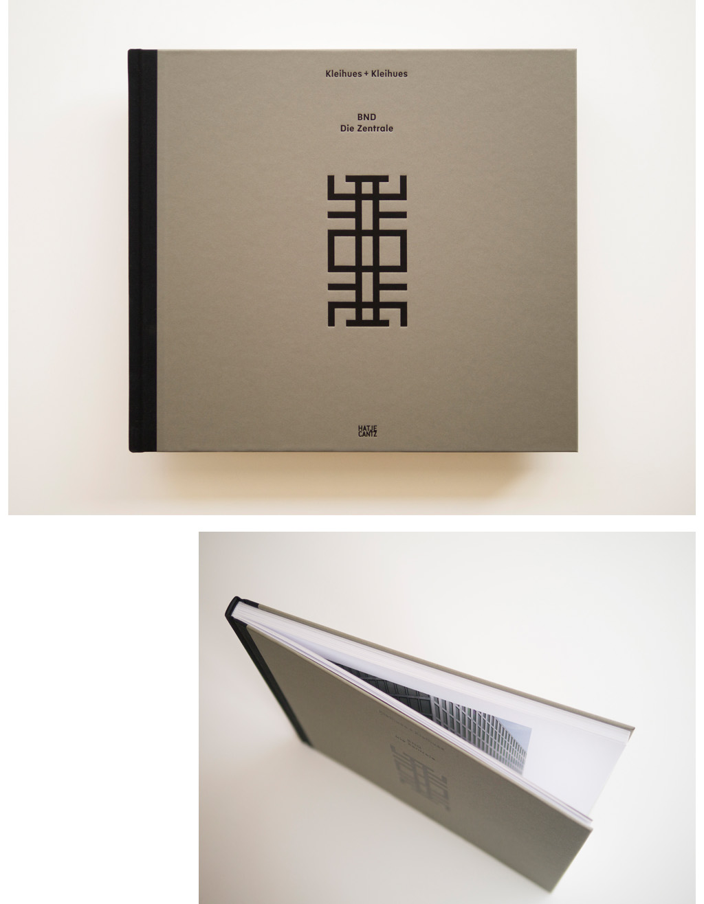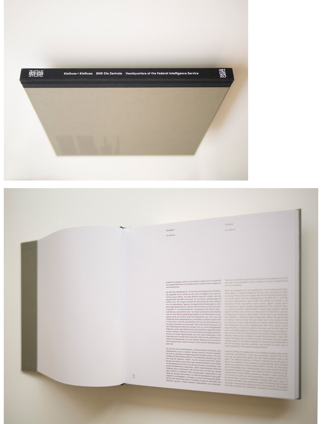 Für die Werkmonografie der Bundesnachrichtendienstzentrale in Berlin die von Kleihues + Kleihues Architekten aufgelegt und von Hatje Cantz publiziert wird, wurde eigens die Schrift BND Sans geschnitten und ausgearbeitet. Diese fügt sich durch die gewählten Proportionen und in ihre formalen Eigenheiten perfekt in das Raster, welches von der Architektur in das Layout übernommen wurde. Die verwendeten Schriftschnitte sind fein aufeinander abgestimmt und erscheinen trotz Größenunterschiede in einer Schrift gesetzt. Ergänzt wird dies von einer sich auf das Wesentliche konzentrierenden Typografie, die durch ihre Ruhe die Einstimmung auf den Bildteil bietet.