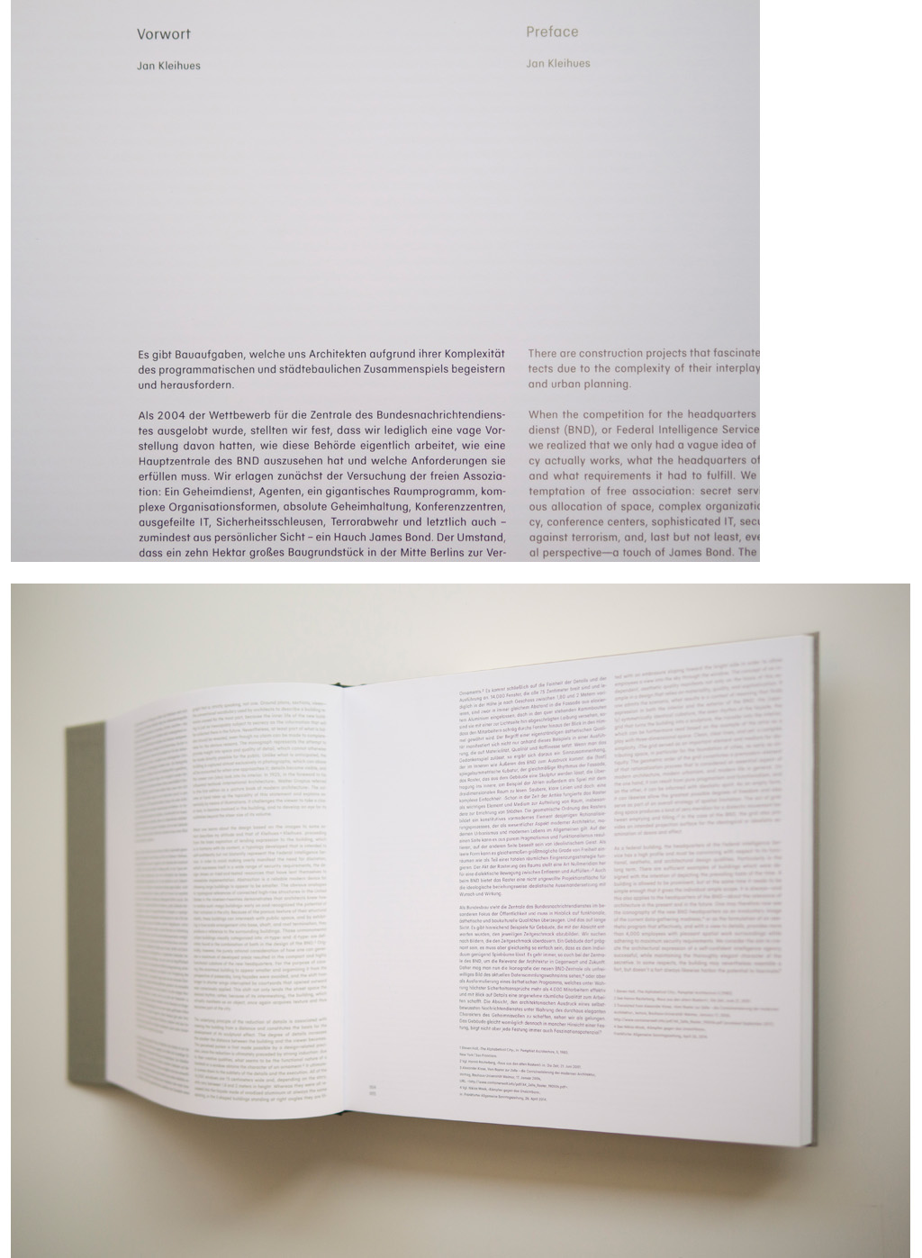Pour la monographie du siège social de l’agence de renseignements allemand à Berlin, réalisée par Kleihues + Kleihues architectes, publiée par Hatje Cantz, une police d’écriture personnalisée BND Sans a été créée et raffinée. En raison des proportions choisies et de leur aspect formel, cette dernière s’intègre parfaitement dans la grille qui a été adoptée par l’architecture dans la mise en page. Les différentes polices utilisées sont finement réglées et ajustées avec précision pour donner l’impression d’une seule police utilisée, bien que différentes tailles de police aient été composées. Ce type trouve son élaboration par la typographie réduite et simple, qui facilite le passage de la partie picturale vers une apparence plus puissante.