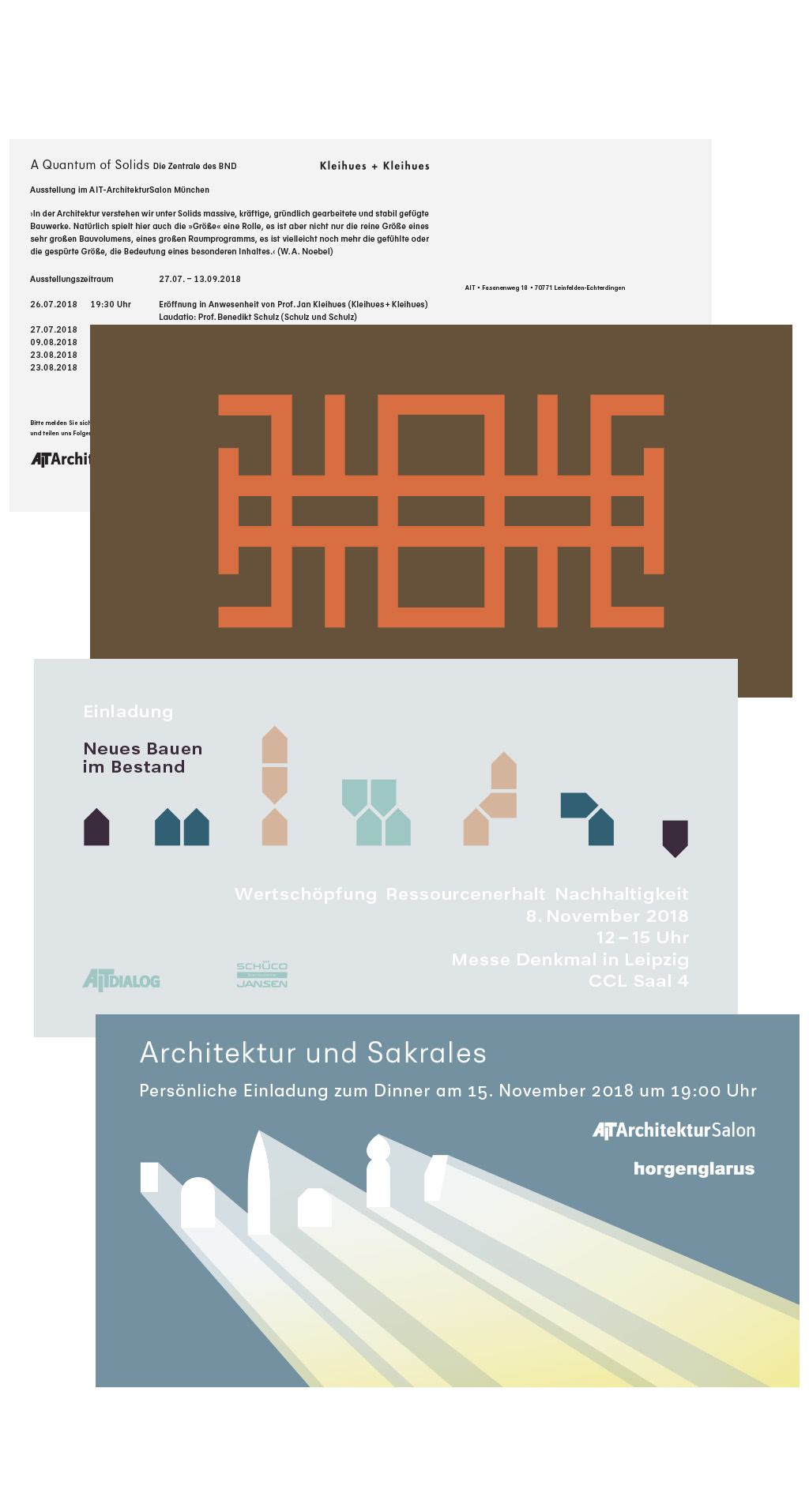 The specialist publisher AIT publishes in the field of architecture, interior design and design. Invitation cards were designed for several events. By using a simple form of illustration paired with a correspondingly reduced typography the cards offer a taste of the events in the field of architecture.