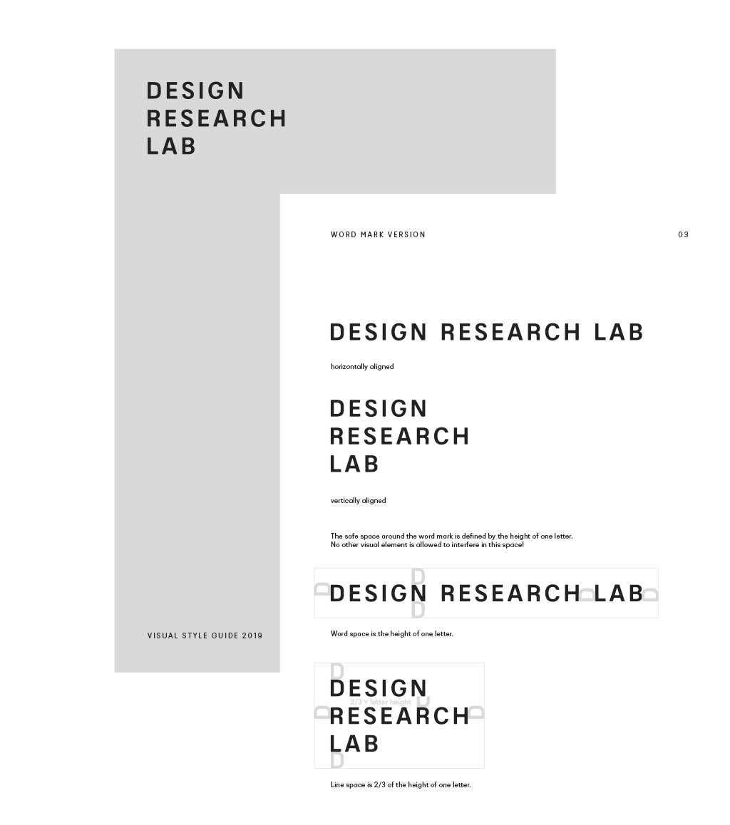 The Design Research Lab of the University of Arts in Berlin needed a redesign of its wordmark and a new visual identity. The Lab with its international leading design research works in a wide range of autonomous projects and offers a visually heterogenic design environment. Therefore, a visual leitmotiv was conceived. The distinct and well-arranged wordmark offers a simple and universal solution and serves as a visually stringent backbone of internal and external communication.
