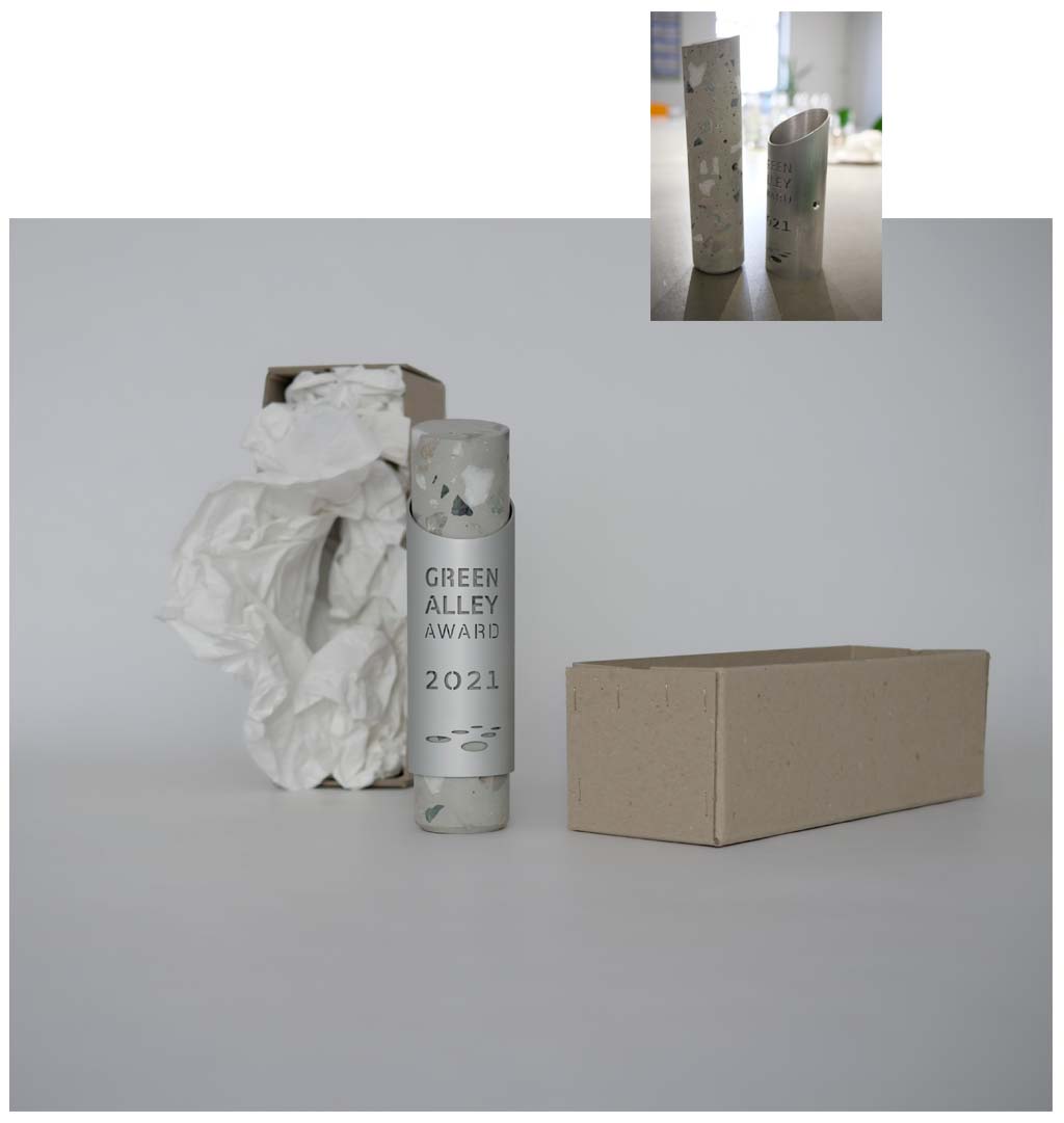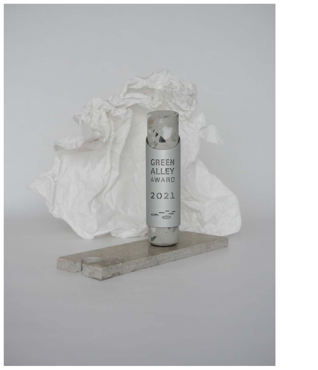 Le succès croissant du prix Green Alley Award redemande une nouvelle forme du trophée pour 2021. Le prix annuel couronne des start-ups qui ont créé leur entreprise autour de l’économie circulaire avec des produits ou des services durable. L’internationalisation de l’audience, l’augmentation des soumissions et l’influence grandit du média avait son influence sur la forme du prix et son emballage. Les valeurs qui ont formé le premier prix (de 2014 à 2019) sont néanmoins valable. Les pierres moulées dans la forme du béton sont des déchets du l’industrie locale. La composition du prix et séparable dans des matériaux recyclable et aucune enduction empêche la réutilisation des matériaux. Naturellement l’information le plus important : le nom, le signe et l’année sont créé par omission du matériau et constitue une esthétique contemporaine et une impression holistique.