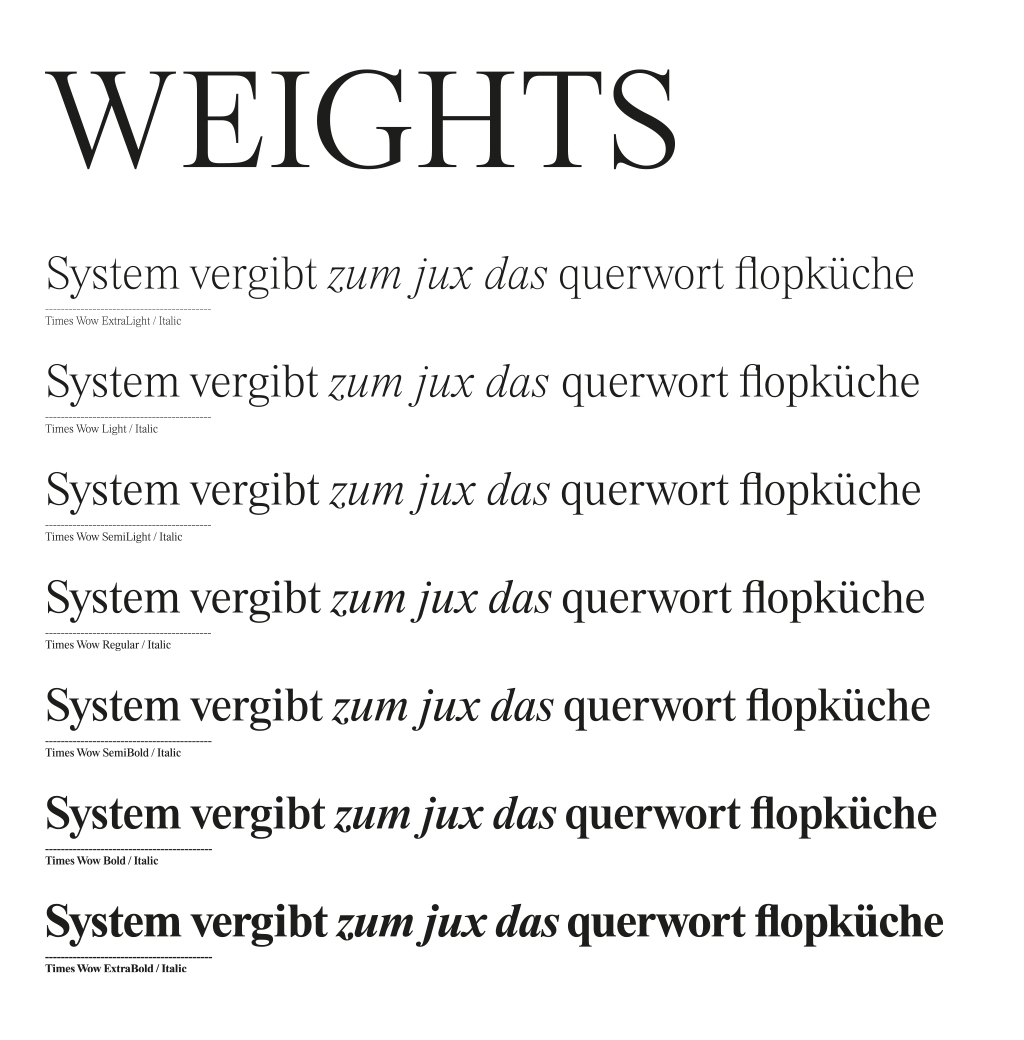 Was passiert, wenn der Times der klassizistische Anzug der Times New Roman® Bold angezogen wird? Fein abgestimmt als Schriftfamilie präsentiert sich ›Times Wow‹ in schmaler oder normaler Breite als elegante Bekleidung für zeitgenössische Inhalte. ›Times Wow‹ lädt trotz ihrer Strenge zum Spiel ein. Dabei scheinen die Tugenden der vertrauenswürdigen Schrift dem Buchstaben, Wort und Text besonderes Gewicht zu verleihen. Ein Tuch, mal durchscheinend leicht, mal dicht und stark gewirkt. Die Gewichte und Schnitte sind auf die der ›Times Now‹ abgestimmt und warten auf neue Kombinationen.