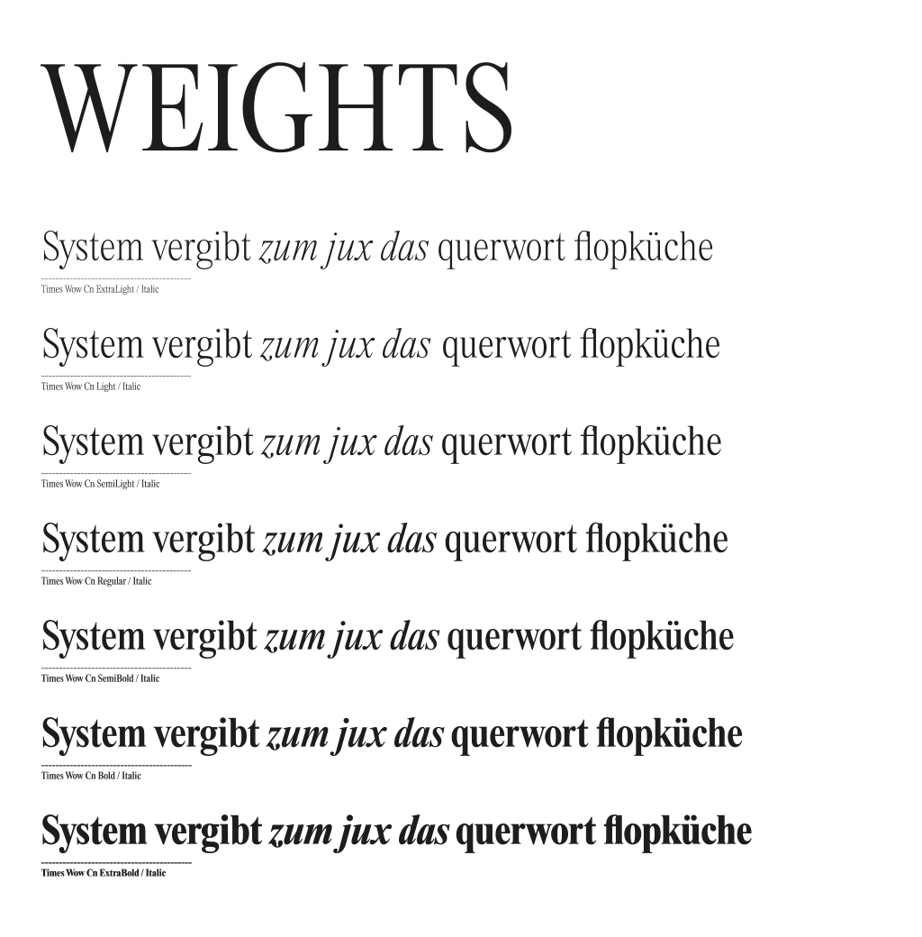 What happens if the Times typeface wears the neoclassical suit of Times New Roman® Bold? The fine-tuned type family ›Times Wow‹ appears, in narrow or normal width, as elegant apparel for contemporary content. Despite the font’s restrained look, ›Times Wow‹ invites playfulness. The virtues of the most trustworthy typeface lend letters, words and text a unique authority. A knit cloth, on one side translucent and light, on the other thick and extrabold. The weights and cuts are balanced with ›Times Now‹ in anticipation of playful combinations.